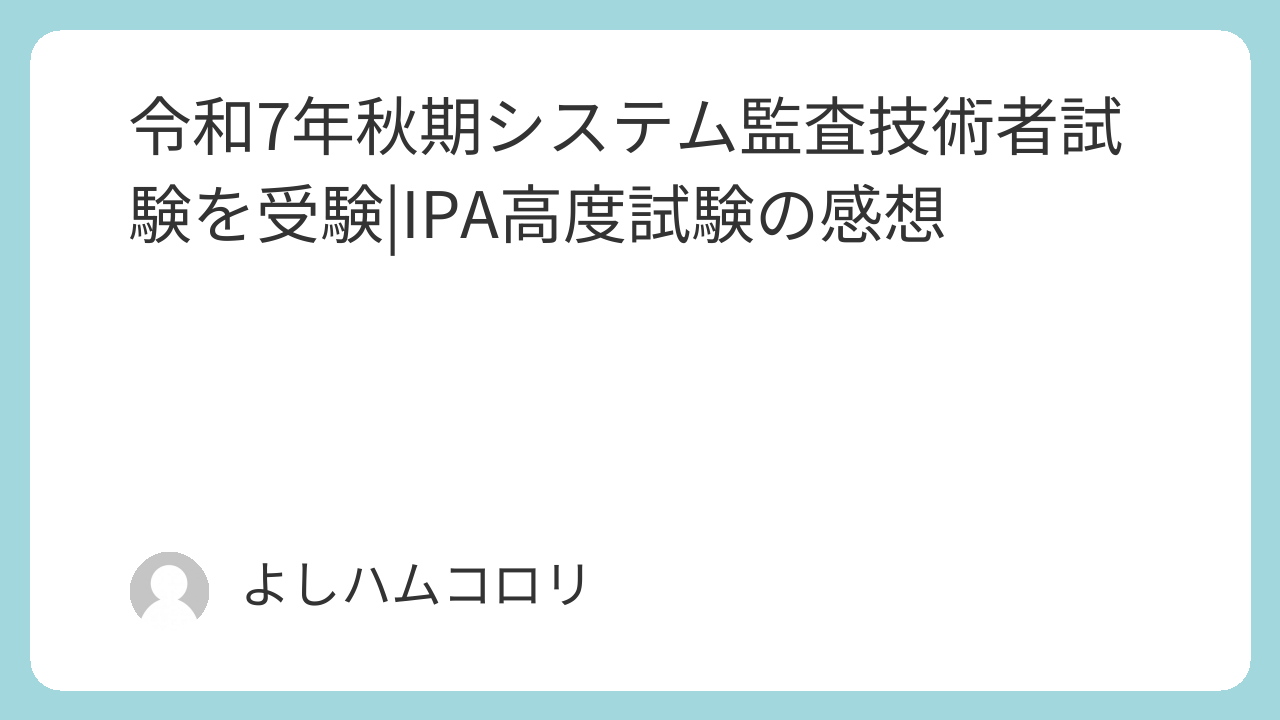 記事を開いていただきありがとうございます。熊本で25年以上ITエンジニアをしているよしハムコロリと申します。2025年10月12日にIPAのシステム監査技術者試験(AU)を受けてきました。受験された皆様お疲れ様でした。悲しくも当日の公式解答で自己採点をした結果、午前Ⅱ試験が48点で敗退でした…。